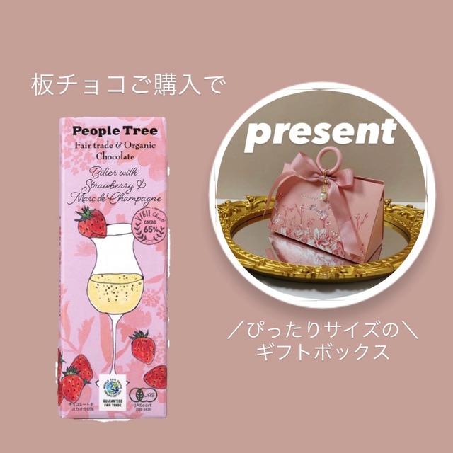 14日迄専用ボックスプレゼント 基本的におひとり様1箱おつけしますが 板チョコ複数枚ご購入でボックスのご希望個数がある方は備考欄に個数をご記入下さい。 カカオ分約65% マール・ド・シャンパーニュを練り込んだビターチョコに、甘酸っぱい有機イチゴのアクセント 植物原料のみで製造した「ベジチョコ」ラインです。マール・ド・シャンパーニュを練り込んだビターチョコに、甘酸っぱい有機イチゴを散りばめました。 シャンパーニュ地方産のマール(ブランデーの一種)はフランス最高峰として知られています。 【注意】本品はアルコール分約2%を含みます。お子様や妊婦、授乳中の方、アルコールに弱い方、運転時などはご遠慮ください フェアトレード&オーガニック原材料のピュアな味わい ボリビアのカカオ豆やフィリピンの黒砂糖など、立場の弱い小規模農家を守るフェアトレード原材料を使用しています。また、ベースとなるカカオ、ココアバター、黒糖、粗糖をはじめ、トッピングもすべて有機原材料を使用。ミルクチョコは、世界で最も厳しい動物保護法を持つスイスで放牧によってのびのびと健康的に飼育された乳牛の、最高品質ミルクがおいしさのベース。さらに粉状ヘーゼルナッツで深い味わいをプラスしています。 【主なフェアトレード生産者】 ■ボリビア / 協同組合エル・セイボ カカオ豆の生産者団体のひとつ。1977年からカカオ豆の小規模農家が集まり、より安定した生活のために、フェアトレードによる新たな販路を拡大。今では収益を、組合員や地域発展へ還元。奨学金で学ぶ子どもたちもいます。 ■フィリピン / ネグロス島の黒砂糖 サトウキビ生産地でしたが、80年代半ば、国際市場暴落により砂糖産業が壊滅状態となり飢餓に陥ったことをきっかけに、援助団体と協力、白砂糖の輸出に頼っていた状態からの自立を目指し、伝統的なマスコバド糖の生産を復活させました。 乳化剤不使用 最大72時間、練りにこだわる 乳化剤を使わず洗練されたカカオの香味とまろやかさを引き出したチョコです。本来、乳化剤を加えずになめらかに仕上げるのは大変難しいことなのですが、ミルクチョコ発祥の地であるスイスの工場では、統的な練り技術(コンチング)によって、最大72時間、長い時間をかけて生地を練り上げます。 ていねいにつくられた素材を、ていねいに練り上げる、おいしさの秘密です。 ※『ラムフィリング』のみ、フィリング部分に有機ひまわりの種由来の乳化剤を使用しています。 代替油脂不使用 ココアバターで最高の口どけ 体温で溶けだすほど温度にデリケートで溶けやすいココアバターを贅沢に使っているので、温かい季節には販売することができません。植物性油脂を代用したチョコレートとはひと味違う、やさしくなめらかな口どけをお楽しみください。 有機黒糖と有機粗糖をチョコの風味に合わせて使い分け フィリピンの有機黒糖と、パラグアイの有機粗糖を使用。サトウキビの絞り汁を煮詰めたコクのある黒糖や、さっぱりした粗糖を、チョコの風味に合わせて使い分けています。どちらもミネラルを含む砂糖で、コクのある甘みのチョコレートになります。 (※デーツ&フィグのみ砂糖不使用、デーツパウダー使用。) カカオポイントでカカオ農家を応援 板チョコの包み紙にあるカカオポイントを集めて応募すると、カカオ農家をサポートできます。応募方法は、包み紙についているポイントを切り取って、応募用紙に貼って、ポストに投函するだけ。10カカオポイントにつき1USドルをオーガニック農法に取り組む コスタリカのカカオ農家に寄付され、カカオ生産地への苗木の寄贈や、有機農業の発展のための技術開発に役立てられています。
