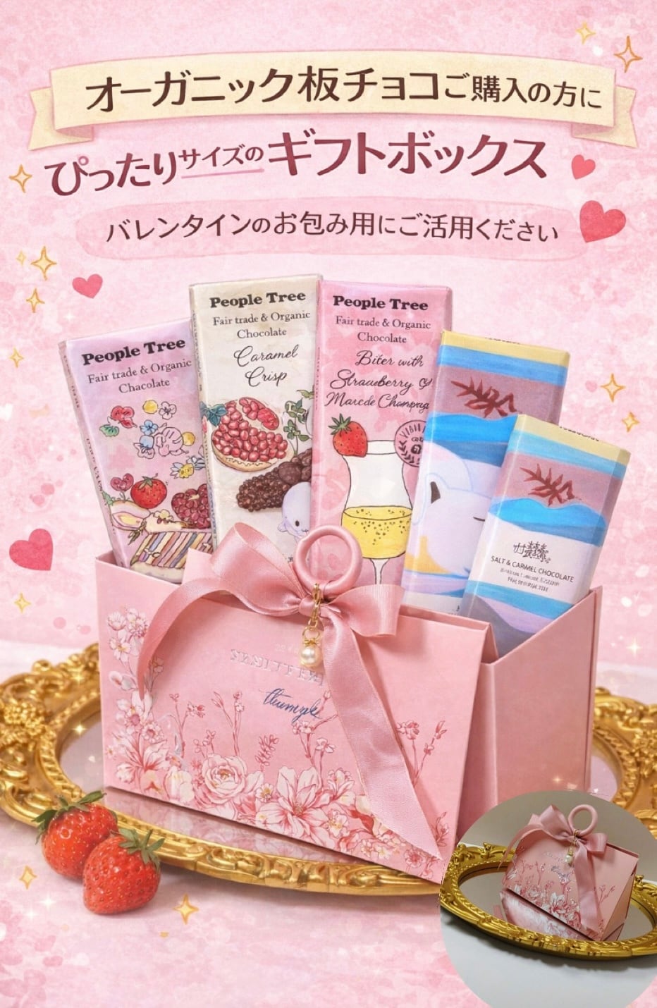 2/5入荷分 14日迄専用ボックスプレゼント 基本的におひとり様1箱おつけしますが 板チョコ複数枚ご購入でボックスのご希望個数がある方は備考欄に個数をご記入下さい。 バレンタイン&ホワイトデー時期限定パッケージ カカオ分32%以上 口当たりまろやかで、ミルク感がたっぷり 黒糖のコクのある甘味のまろやかなミルクチョコレートです。人気の定番チョコレートをスペシャルパッケージで。 フェアトレード&オーガニック原材料のピュアな味わい ボリビアのカカオ豆やフィリピンの黒砂糖など、立場の弱い小規模農家を守るフェアトレード原材料を使用しています。また、ベースとなるカカオ、ココアバター、黒糖、粗糖をはじめ、トッピングもすべて有機原材料を使用。ミルクチョコは、世界で最も厳しい動物保護法を持つスイスで放牧によってのびのびと健康的に飼育された乳牛の、最高品質ミルクがおいしさのベース。さらに粉状ヘーゼルナッツで深い味わいをプラスしています。 【主なフェアトレード生産者】 ■ボリビア / 協同組合エル・セイボ カカオ豆の生産者団体のひとつ。1977年からカカオ豆の小規模農家が集まり、より安定した生活のために、フェアトレードによる新たな販路を拡大。今では収益を、組合員や地域発展へ還元。奨学金で学ぶ子どもたちもいます。 ■フィリピン / ネグロス島の黒砂糖 サトウキビ生産地でしたが、80年代半ば、国際市場暴落により砂糖産業が壊滅状態となり飢餓に陥ったことをきっかけに、援助団体と協力、白砂糖の輸出に頼っていた状態からの自立を目指し、伝統的なマスコバド糖の生産を復活させました。 乳化剤不使用 最大72時間、練りにこだわる 乳化剤を使わず洗練されたカカオの香味とまろやかさを引き出したチョコです。本来、乳化剤を加えずになめらかに仕上げるのは大変難しいことなのですが、ミルクチョコ発祥の地であるスイスの工場では、統的な練り技術(コンチング)によって、最大72時間、長い時間をかけて生地を練り上げます。 ていねいにつくられた素材を、ていねいに練り上げる、おいしさの秘密です。 ※『ラムフィリング』のみ、フィリング部分に有機ひまわりの種由来の乳化剤を使用しています。 代替油脂不使用 ココアバターで最高の口どけ 体温で溶けだすほど温度にデリケートで溶けやすいココアバターを贅沢に使っているので、温かい季節には販売することができません。植物性油脂を代用したチョコレートとはひと味違う、やさしくなめらかな口どけをお楽しみください。 有機黒糖と有機粗糖をチョコの風味に合わせて使い分け フィリピンの有機黒糖と、パラグアイの有機粗糖を使用。サトウキビの絞り汁を煮詰めたコクのある黒糖や、さっぱりした粗糖を、チョコの風味に合わせて使い分けています。どちらもミネラルを含む砂糖で、コクのある甘みのチョコレートになります。 (※デーツ&フィグのみ砂糖不使用、デーツパウダー使用。) カカオポイントでカカオ農家を応援 板チョコの包み紙にあるカカオポイントを集めて応募すると、カカオ農家をサポートできます。応募方法は、包み紙についているポイントを切り取って、応募用紙に貼って、ポストに投函するだけ。10カカオポイントにつき1USドルをオーガニック農法に取り組む コスタリカのカカオ農家に寄付され、カカオ生産地への苗木の寄贈や、有機農業の発展のための技術開発に役立てられています。
