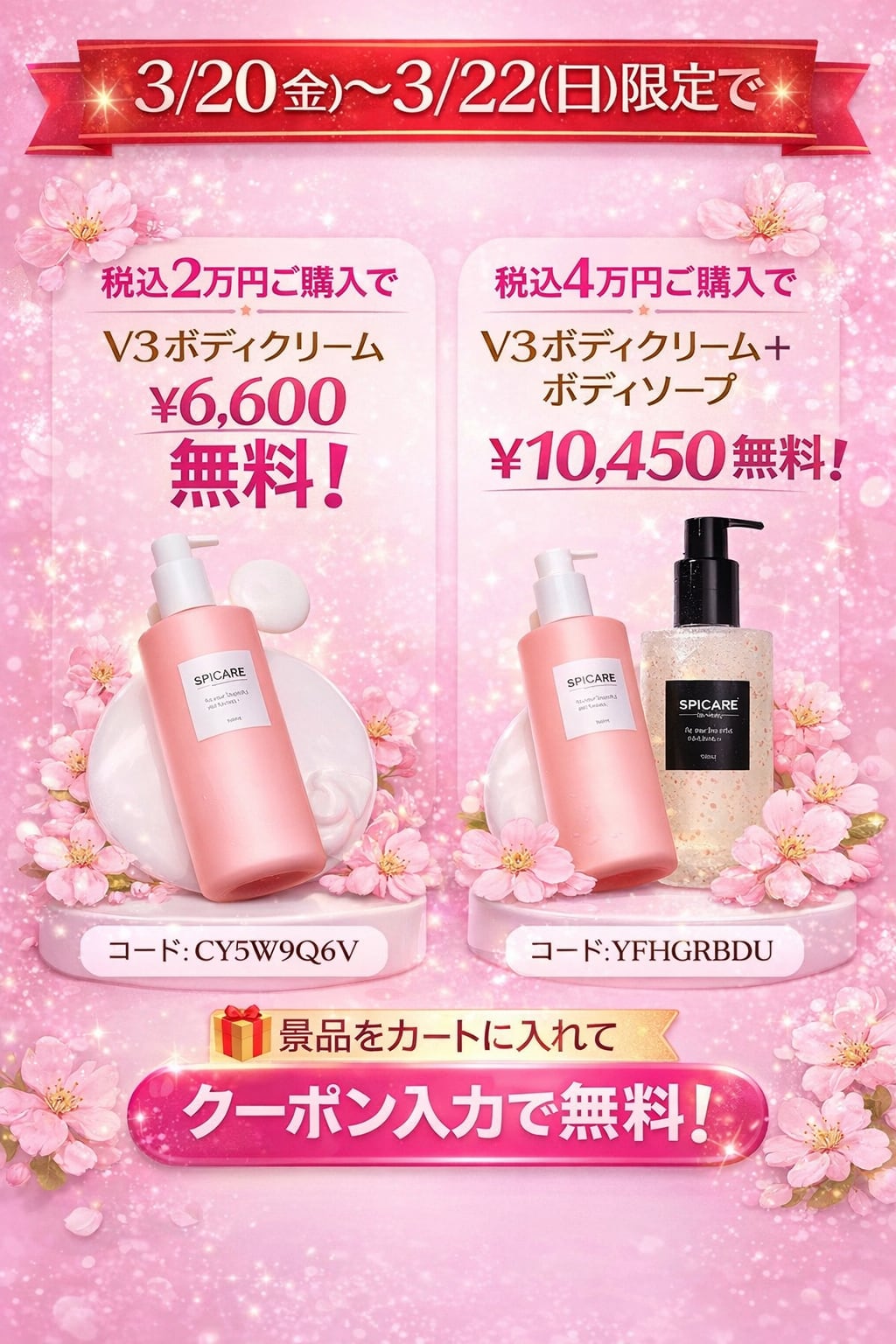 数量限定‼ SPICARE V3 VSPIC Cサンセラム × Cマスク キャンペーンセット 紫外線・乾燥・くすみが気になる季節に。 新商品“守りながら整える”Cサンセラムに“集中補給”のCマスクがついてくる大変お得な特別セットをご用意いたしました‼ 日中のケアとスペシャルケアを同時に叶え、透明感のあるなめらかな肌へ導きます。 【セット内容】 ♣V3 VSPIC Cサンセラム 30ml × 1個 ♣V3 VSPIC Cマスク(3枚入) × 1箱 商品説明 HARI×ビタミンCのパワーで輝くような素肌へ SPF50+/PA+++ SPICARE C LINEからビタミンC※1を含有した独⾃成分グロウスピキュール※2とペプチドコンプレックス※3、植物由来成分※4の配合により紫外線対策に敏感な⼥性をターゲットとしたSun Serumが登場。 塗るたびに肌をケアできる、進化系UVセラムです。 美容HARI※2×ビタミンC※1で、スキンケアする⽇焼け⽌め。 ※1 アスコルビン酸(整肌)、 ※2 シリカ(整肌)、※3 トリペプチド-1銅、アセチルヘキサペプチド-8、ヒト遺伝⼦組換オリゴペプチド-1、合成ヒト遺伝⼦組換ポリペプチド-1、合成ヒト遺伝⼦組換ポリペプチド-3(すべて整肌)、※4 スベリヒユエキス、アロエベラ葉エキス、ヒポファエラムノイデス果実エキス (すべて保湿) ♡プレゼント内容♡ 内容量: Cサンセラム30ml/Cマスク1箱(3枚入)