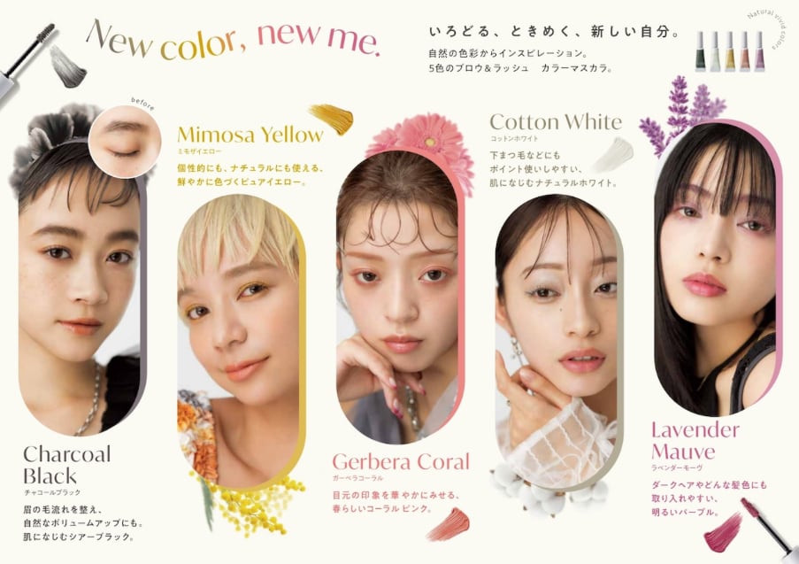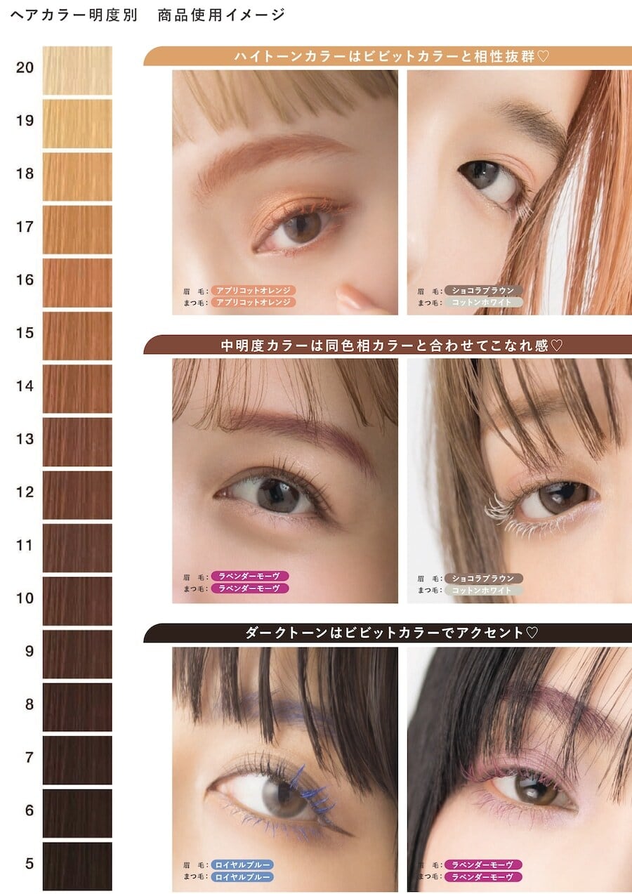 自眉、自まつ毛の色を打ち消し、鮮やかに発色。あらゆるヘアカラーともなじみやすく、あか抜け感が手に入ります。