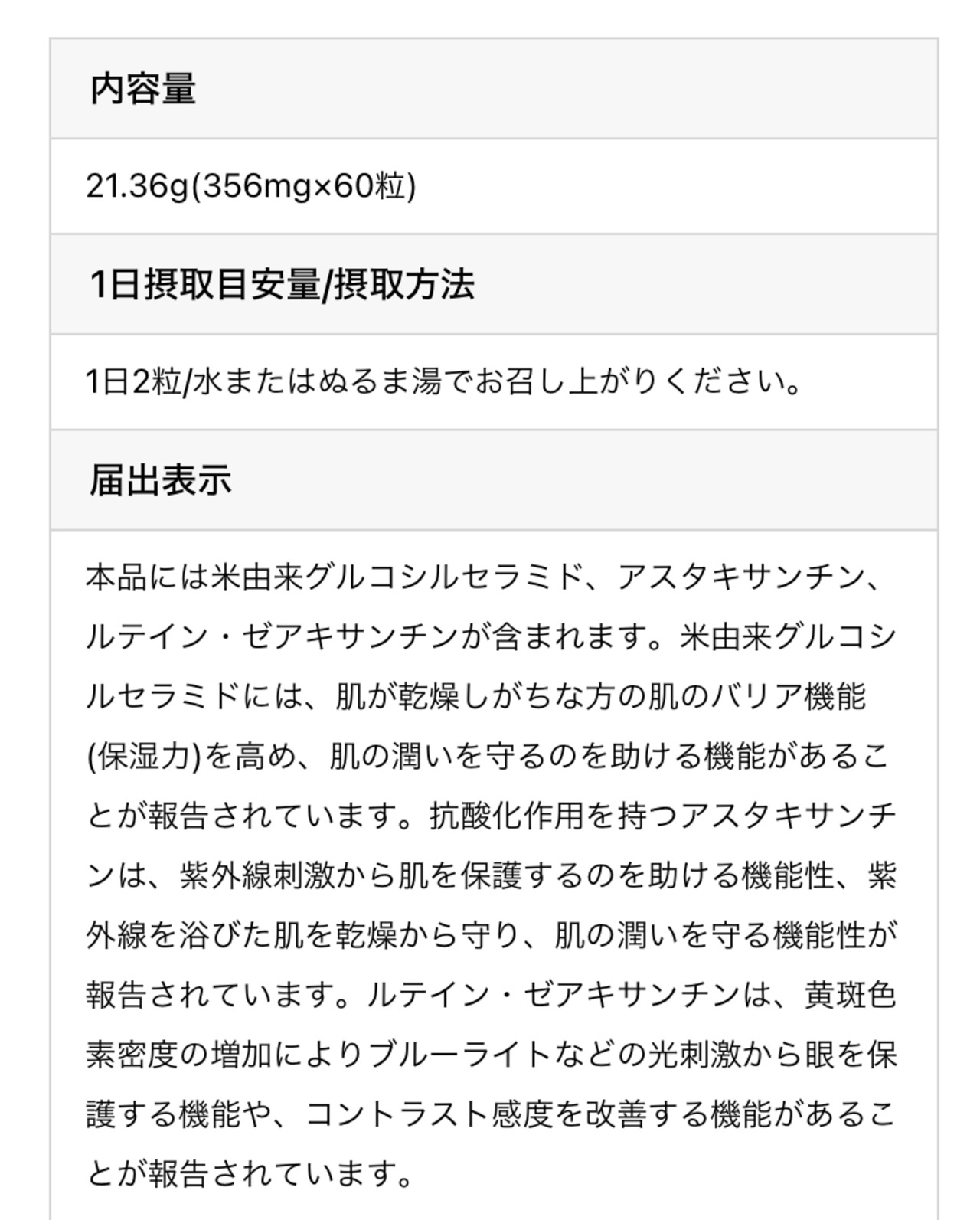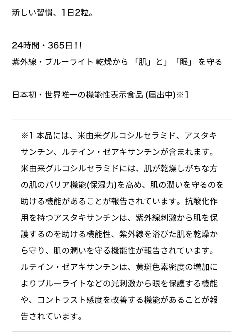 【米由来グルコシルセラミドアスタキサンチン・ルティン・ゼアキサンチンを含有】