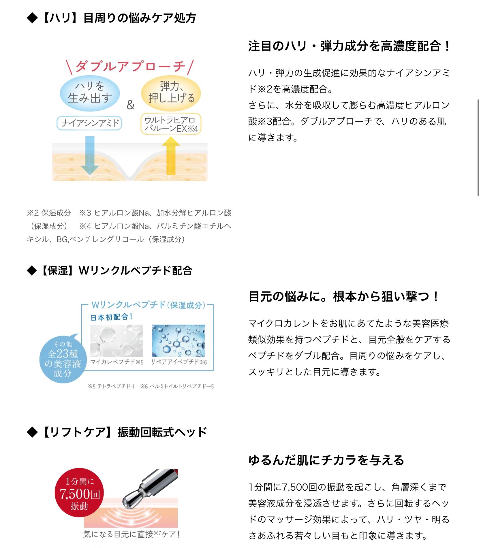 先端が振動・回転する美顔器と、ハリ・弾力の生成促進に効果的なナイアシンアミド※1を高濃度配合した目元美容液が一体化。 美容液成分97%配合の高機能目元美容液。 目の下のゆるみなどのエイジングサインに全方位からアプローチ。振動を与えながら美容液を塗ることで目元のめぐりを高め、エイジングケア※2成分が隅々まで浸透※3します。 高機能原料を高濃度配合し、 こだわりのバランスでできた高機能目元美容液です。