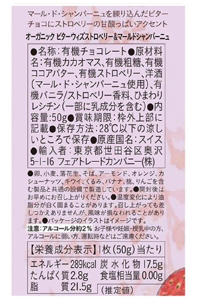 カカオ分約65% マール・ド・シャンパーニュを練り込んだビターチョコに、甘酸っぱい有機イチゴのアクセント